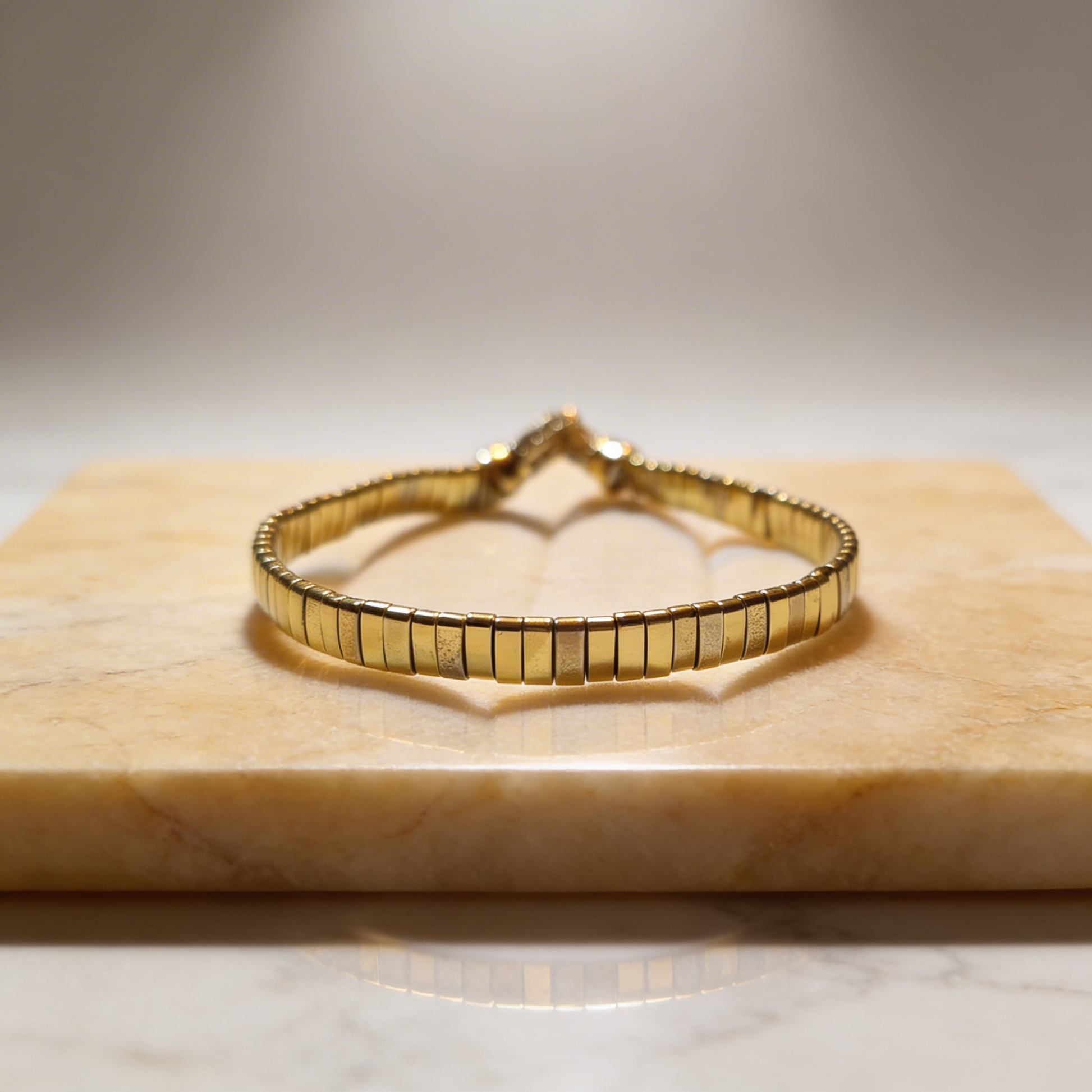 Crafted with sleek gold Miyuki beads, this piece creates a smooth, continuous line around the wrist — refined, elegant, and timeless. Its clean structure makes it perfect for layering or wearing on its own for a subtle statement.