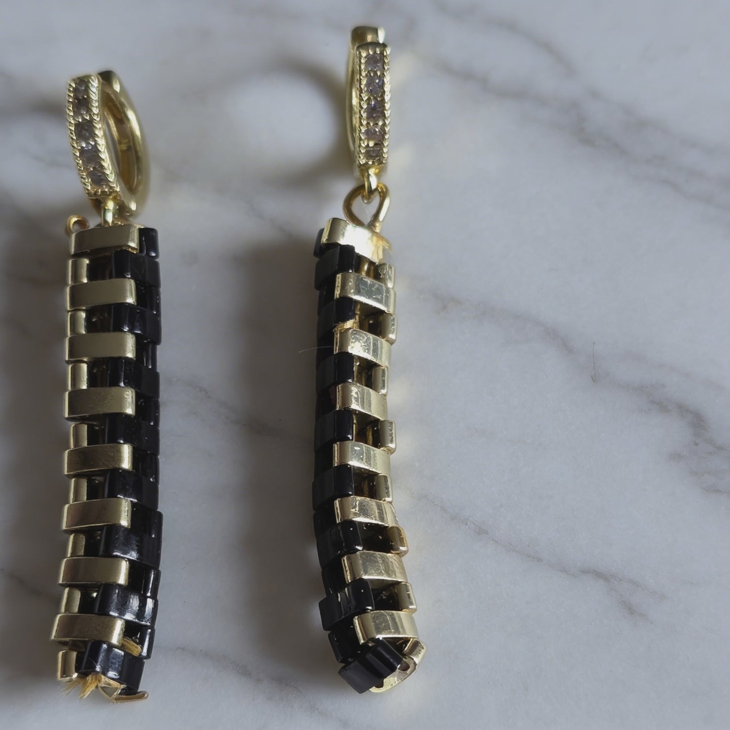 Precision in black and gold. Black Axis is a handcrafted earring woven from Japanese Miyuki Half Tila beads — a geometric elongated silhouette that balances contrast with quiet confidence.